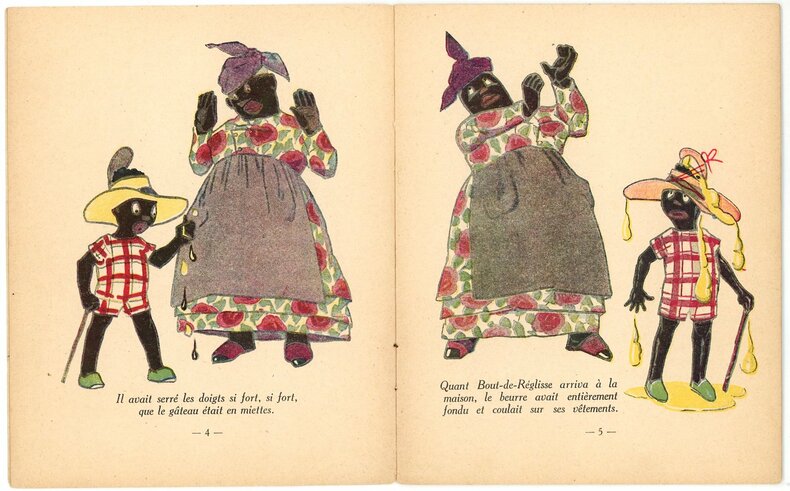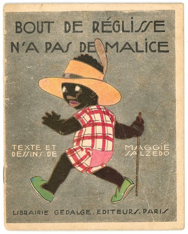 Petit garçon de couleur, Bout-de-Réglisse manque de bon sens et sa maman créole se désespère. Inventive créatrice des années trente, Maggie Salzedo (1890-1959), dans ce simple petit ouvrage, nous offre tout son “talent de coloriste, l’originalité et l’invention des tissus aux couleurs vives”. Elle fut une des illustratrices qui “savent laisser à la postérité l’image du temps où elles vécurent”. Un des six albums pour les tout-petits publiés dans la collection Maggie Salzedo chez Gedalge. Petite trace de pliure sur la première couverture. F. Lévèque et J. Glénisson. Maggie Salzedo. 2000.