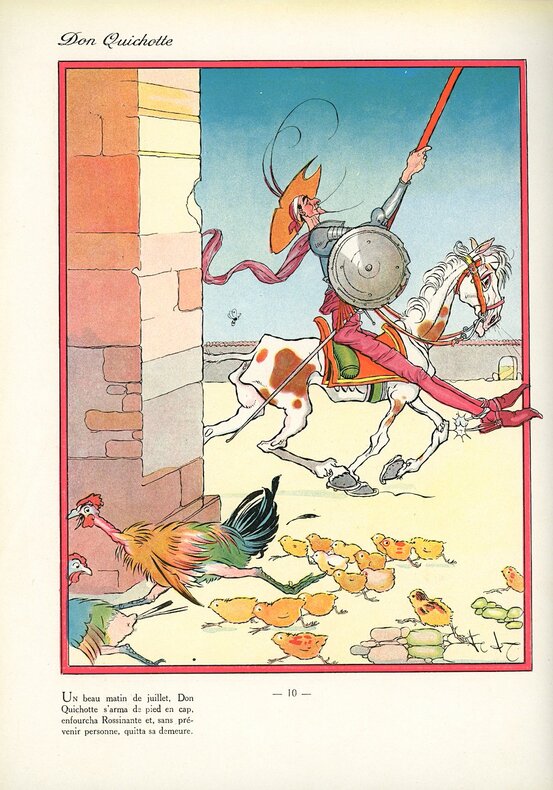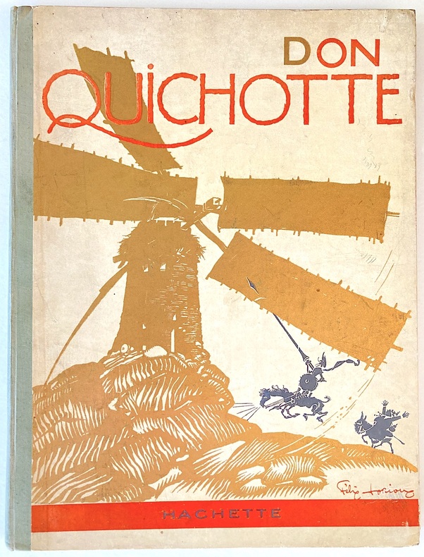 Premier tirage. “Expressivité et virtuosité de la ligne”. Lorioux (1872-1964) illustre un Don Quichotte réduit à 37 pages de texte soulignées de Don Quichotte sur son âne et de culs-de-lampe. Titre et trente deux planches à pleine page, exubérantes et colorées placées dans un encadrement rouge, le papier glacé rend les couleurs encore plus attrayantes. “Franche gaieté et sainte impertinence [...] transforment le héros en une sorte d’hybride mi homme, mi insecte”. En très bonne condition. Angles des plats légèrement frottés, couture un peu lâche.