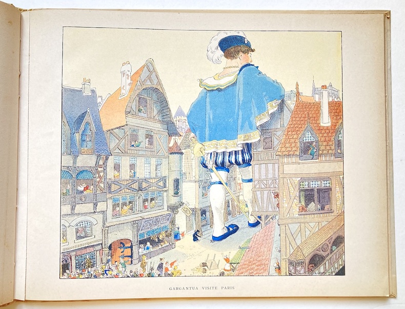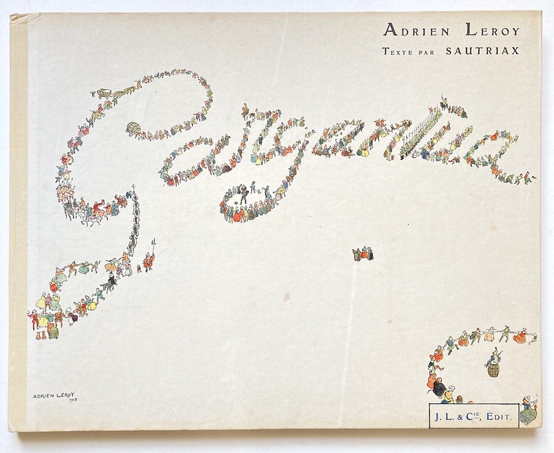 Première édition. Belles et amusantes planches hors texte, sur un beau papier figurant de petits personnages colorés, signées et datées 1913 par l’artiste Adrien Leroy. La vie de Gargantua est également illustrée dans le texte et agrémentée de facétieuses notes en bas de pages. À l’état neuf dans sa jaquette de papier cristal d’origine.