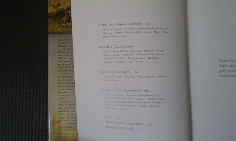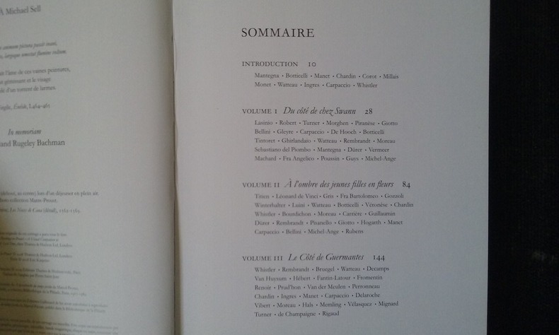 Cet ouvrage illustré de plus de 200 peintures, dessins et gravures magnifiquement reproduits célèbre le lien étroit que tisse Proust dans "La Recherche du temps perdu" entre beaux-arts et littérature. Toutes les ouvres du roman, qu'elles soient nommément citées ou simplement évoquées par Proust, sont ici reproduites avec, en vis-à-vis, le passage de La Recherche dans lequel elles sont mentionnées. Anges de Botticelli, courtisanes de Manet, guerriers de Mantegna et saints de Carpaccio se mêlent ainsi aux nymphéas de Monet et aux gravures de Rome par Piranèse. Pour les amoureux de Proust ou pour tous ceux qui souhaitent découvrir ce chef d'oeuvre de la littérature française, d'une autre façon... Voir le sommaire sur photos jointes.