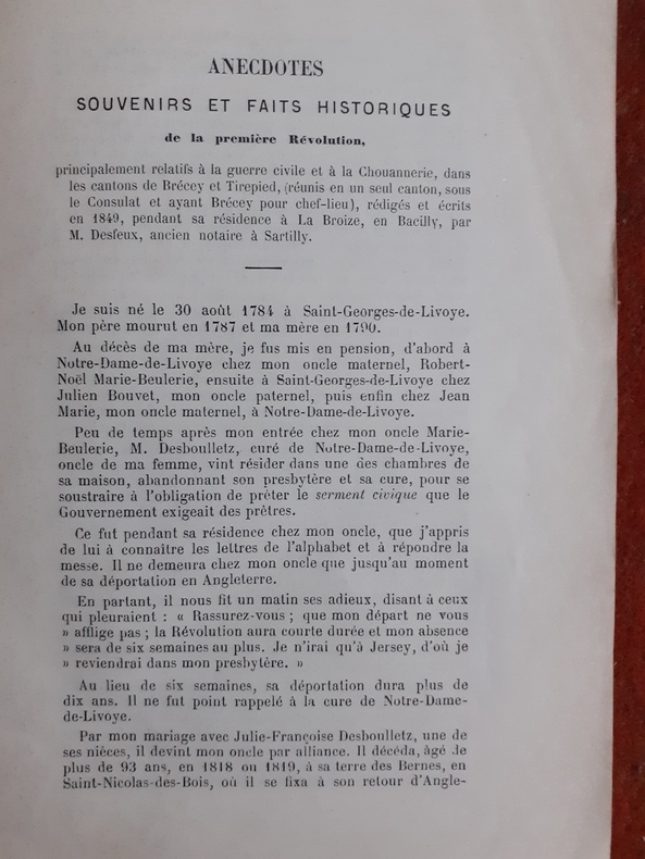 Cet opuscule, dont le texte a été rédigé en 1849, permet de s’imprégner de l’atmosphère qui régnait dans un bourg bas-normand pendant la période révolutionnaire. Les événements décrits concernent pour l’essentiel les opérations des Chouans, de 1794 à 1799, le bourg de Saint-Georges-de-Livoye constituant pour eux un point central. Jean-Baptiste Desfeux, qui avait neuf ans à l'époque des faits et qui deviendra plus tard notaire et maire de Sartilly (Manche), les perçoit du côté "patriote" et ne manque pas de peindre selon ses opinions les exactions des rebelles, combats, perquisitions, exécutions sommaires, etc. Ses souvenirs n’en demeurent pas moins une source précieuse pour l’histoire de la Chouannerie normande.