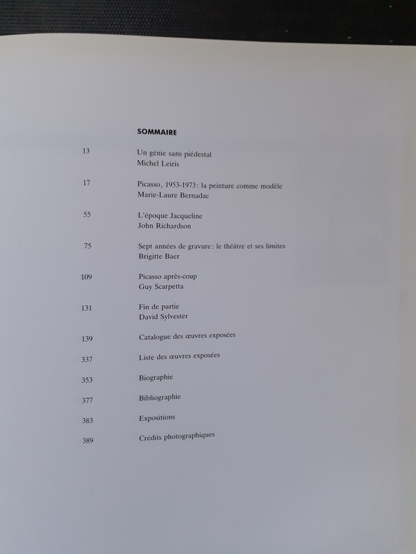 1ère édition, reliée, du catalogue de l'exposition présentée en 1988 au Centre Georges Pompidou (Paris) puis à la Tate Gallery (Londres), organisée par le Musée national d'art moderne (Paris), le Musée Picasso (Paris) et la Tate Gallery, et consacrée aux années 1953-1972 de l'oeuvre de Pablo Picasso (1881-1973): 193 peintures, sculptures, dessins et gravures; précédé de textes de Michel LEIRIS, Marie-Laure BERNADAC, John RICHARDSON, Brigitte BAER, Guy SCARPETTA, David SYLVESTER; biographie; expositions; bibliographie. Exemplaire relié bien complet de sa jaquette (achevé d'imprimer le 4 février 1988).