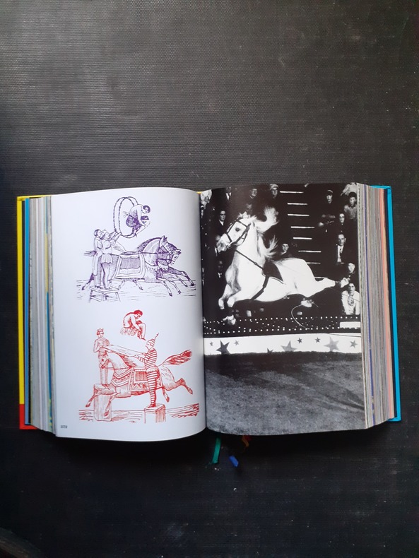 Des illustrations sur le cirque alternent avec des photographies et des affiches de toutes les époques qui montrent en situation contorsionnistes, prestidigitateurs, acrobates, équilibristes, clowns et autres artistes du cirque... avec des définitions, des citations d'auteurs et des extraits d'oeuvres.