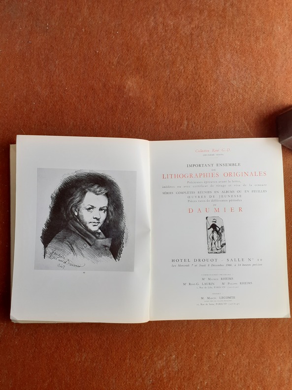 Hôtel Drouot, 1966, in-4 br. (21 x 27), n.p., Collection René G.-D. (Deuxième vente), illustrations, portrait de Daumier en front., bien complet de son feuillet avec la liste des prix d'estimation, sous papier cristal, bon état.