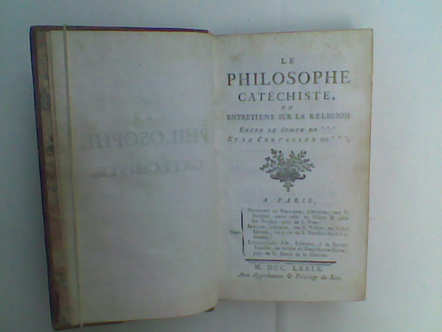 Table : Epitre dédicatoire à S.A.R. Monseigneur le Prince Clément de Saxe - Lettre de M. le Chevalier de *** à l'Abbé ***. 1er Entretien, Le Philosophe moderne passe successivement au déisme et à l'athéisme, après avoir abandonné l'autorité de l'Eglise, son système sur l'existence de Dieu et sur la création du monde - 2ème Entretien, De l'Homme et des animaux - 3ème Entretien, Du vrai bonheur et des vertus sociales - 4ème Entretien, De l'ordre politique - 5ème Entretien, Des ressources de la nouvelle philosophie, contre les désordres de la société - 6ème Entretien, Récapitulation de la doctrine du Philosophe, Brève réfutation de son système. Tableau de la doctrine de J. C. Réponse aux objections des impies - 7ème Entretien, De l'Eglise : de l'Esprit et de la bonne foi philosophique