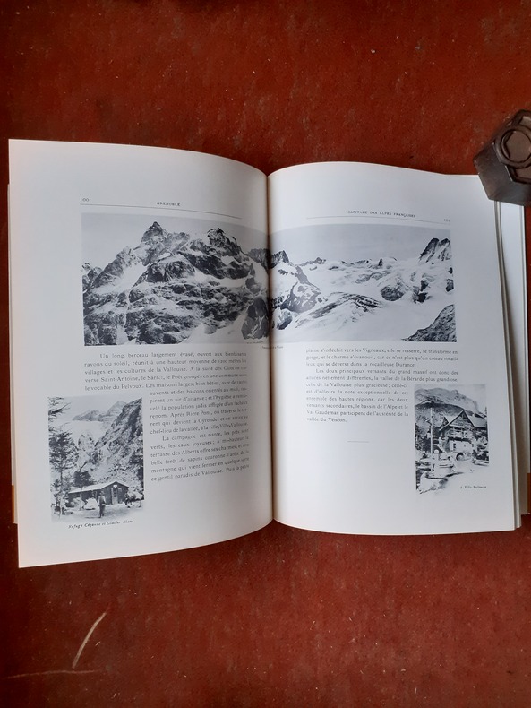 Un ouvrage de 156 pages, format 260 x 335 mm, illustré de 180 gravures imprimées en phototypie dont 8 panoramas en noir, un en couleurs et une carte des Alpes, relié demi-cuir à coins, publié en 1911, Jules Rey Editeurs (Grenoble), bon état