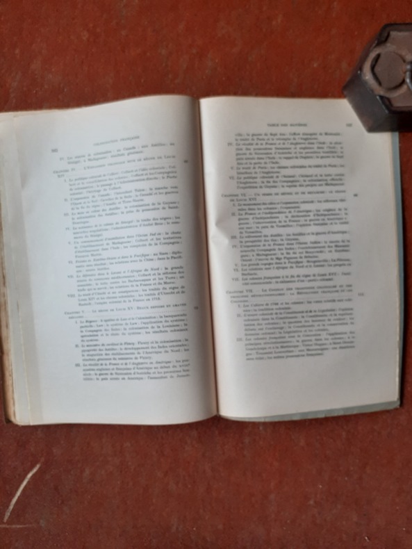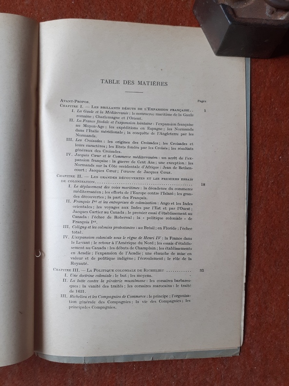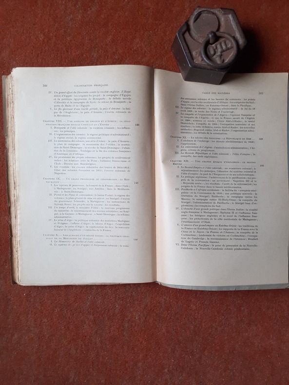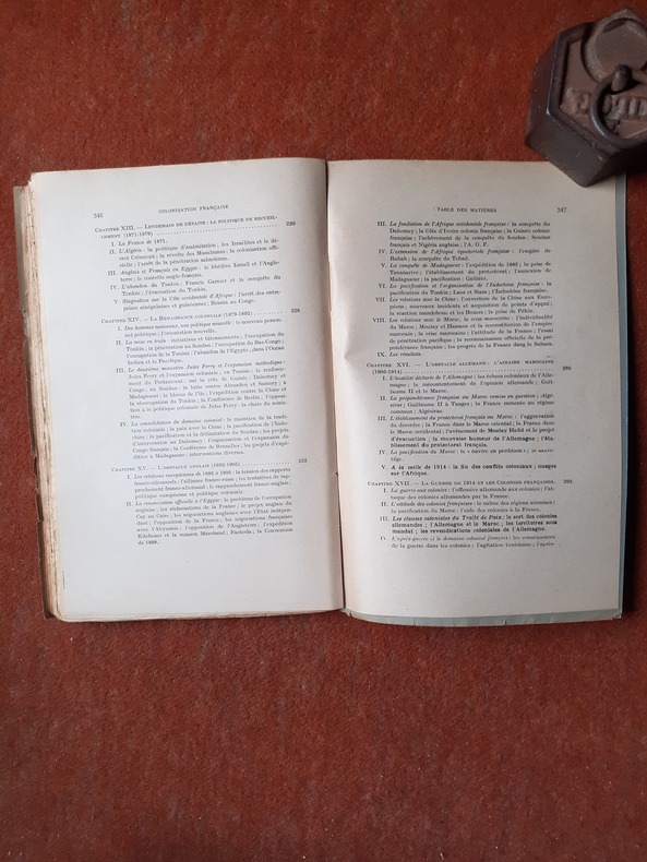 Par Georges Hardy (1884-1972), colonial et théoricien du colonialisme, ancien directeur de l’Ecole coloniale, recteur de l'Académie d'Alger. — Table : Les brillants débuts de l'expansion française ; Les grandes découvertes et les premiers essais de colonisation ; La politique coloniale de Richelieu ; L'expansion coloniale sous le règne de Louis XIV ; Le règne de Louis XV : beaux espoirs et graves défaites ; Un temps de réveil et de revanche : le règne de Louis XVI ; Le conflit des traditions coloniales et des principes révolutionnaires : la Révolution française et les Colonies ; La colonisation française sous le Consulat et l'Empire ; Un grand programme de colonisation : la Restauration ; La politique coloniale de la Monarchie de Juillet ; Le règne des principes : la République de 1848 ; Une grande époque d'expansion : le second Empire : Lendemains de défaite (1871-1879) ; La Renaissance coloniale (1879-1892) ; L'obstacle anglais (1892-1905) ; L'obstacle allemand : l'affaire marocaine (1905-1914) ; La Guerre de 1914 et les Colonies françaises ; L'état actuel et les tendances de l'organisation et de la politique coloniales.