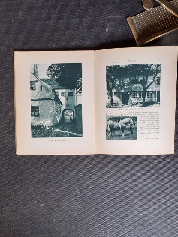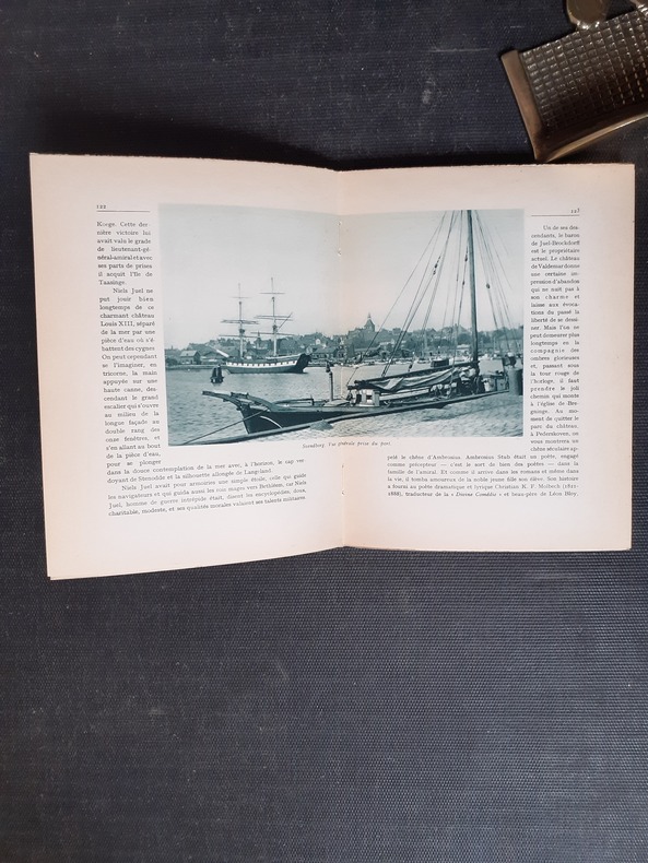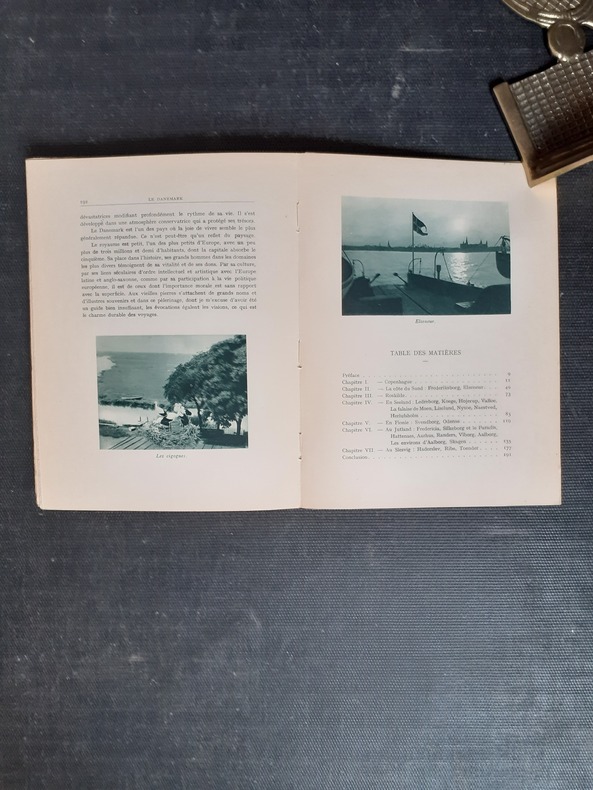 Copenhague, 1935, in-12, 281 pp, 12 pl. de photos, une planche de pavillons danois en 2 couleurs et une carte en dépliant hors texte, plus une grande carte dépliante en couleurs du royaume du Danemark sous pochette in fine, reliure percaline carmin de l'éditeur, dos lisse, titre et écusson blancs au 1er plat, bon état. Peu courant