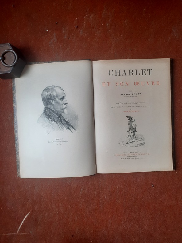Portrait-frontispice de Charlet par Pisan, figures dans le texte. Nicolas Toussaint Charlet (1792-1845), fils d’un dragon de la République, fut un artiste patriote et prolifique, dont l’œuvre lithographiée répertoriée ici comprend 1089 pièces, classées en dix sections, dont portraits, costumes militaires, pièces faites pour l’école Polytechnique… Puisant souvent son inspiration dans l’épopée napoléonienne, il a, selon Charles Baudelaire, “réjoui, amusé, attendri aussi, toute une génération". “Nous nous trompons fort, ou Charlet grandira dans la postérité…”, peut-on lire en introduction de cet ouvrage. Taches et rousseurs.