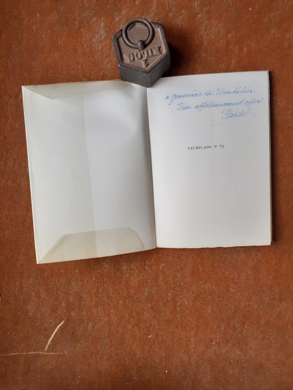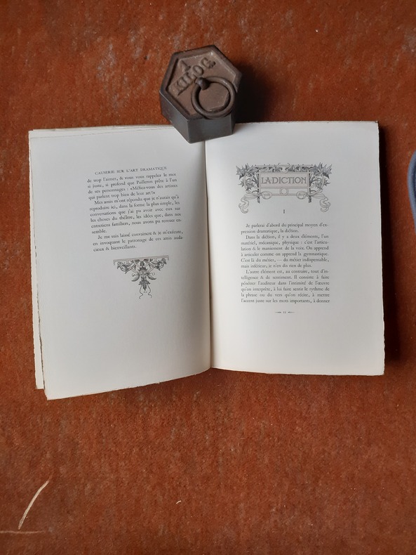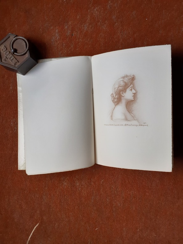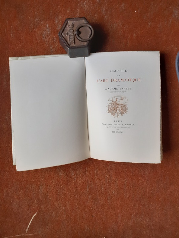 Edouard Pelletan, 1903, gr. in-8 br. (17 x 24), 41 p., tirage à 100 exemplaires numérotés (N° 73), portrait à la sanguine de Mme Bartet par Giraldon, gravures de F. Florian, E.A.S. de l'auteur à Geneviève de Bouhélier, sous papier cristal, très bon état.
