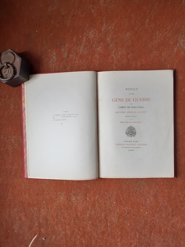 Librairie d'Art Ludovic Baschet, gr. in-8 rel. pleine toile rouge (18 x 25), 72 p., non daté (c. 1870), tirage à 370 exemplaires (l'un des 360 sur papier vélin), avant-propos de l'éditeur accompagné de deux lettres concluantes du Comte de Nieuwerkerke et de A. de Montaiglon, un plan de la forteresse de Coucy pleine page, vignettes in-t., bandeaux, lettrines et cul-de-lampe, pièce de titre et couvertures conservées pour cette bonne reliure récente, bon état.
