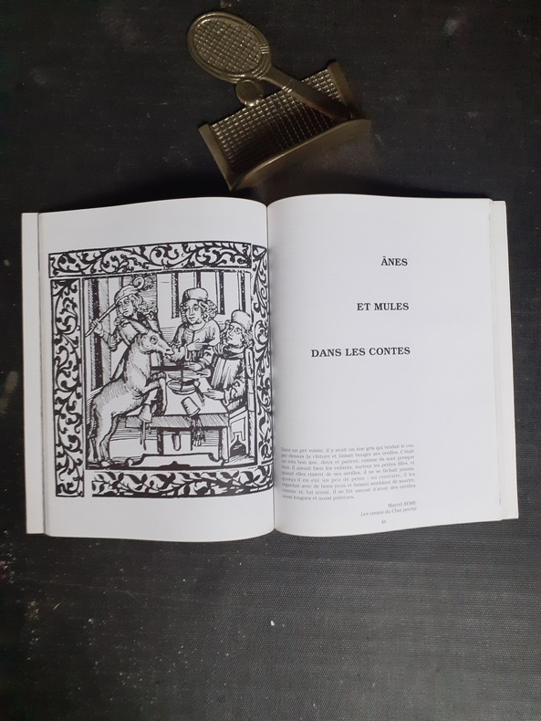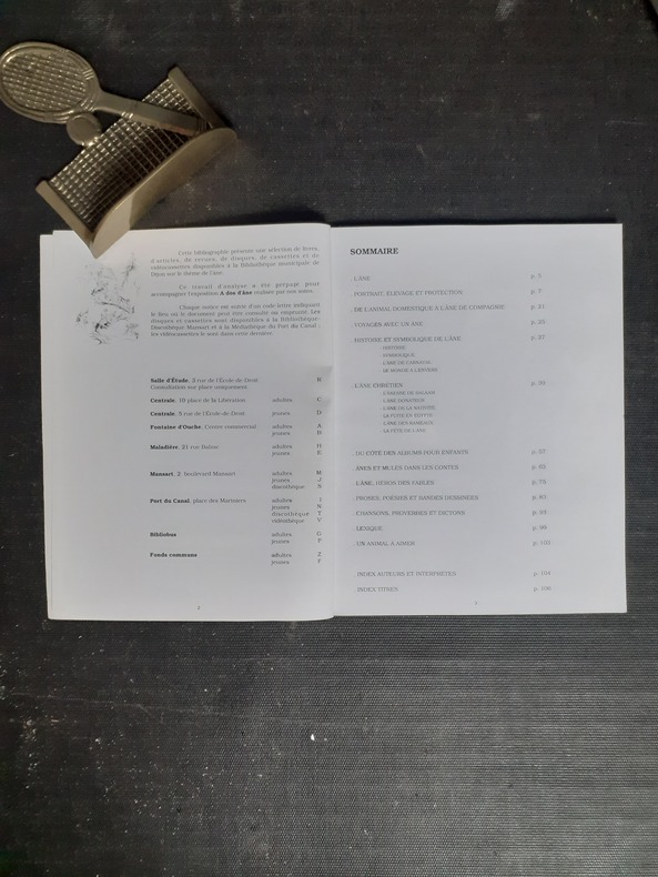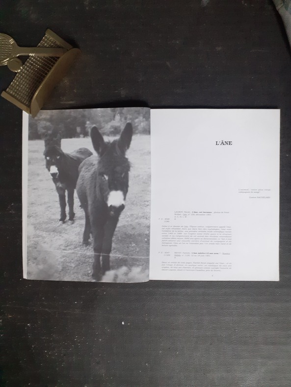 Intéressant et instructif travail d'analyse sur le thème de l'âne, réalisé par la Bibliothèque municipale de Dijon à l'occasion de l'exposition "A dos d'âne", tenue en 1989. Sous la forme d'une bibliographie raisonnée qui présente une sélection de livres, d'articles, de revues, de disques, de cassettes et de vidéocassettes disponibles à la bibliothèque, cette étude traite d'une symbolique riche, complexe voire paradoxale. Victor Hugo en avait d'ailleurs rendu compte dans "La légende des siècles" : "Cet âne abject, souillé, meurtri sous le bâton, est plus saint que Socrate et plus grand que Platon". Voir le sommaire sur photos jointes.