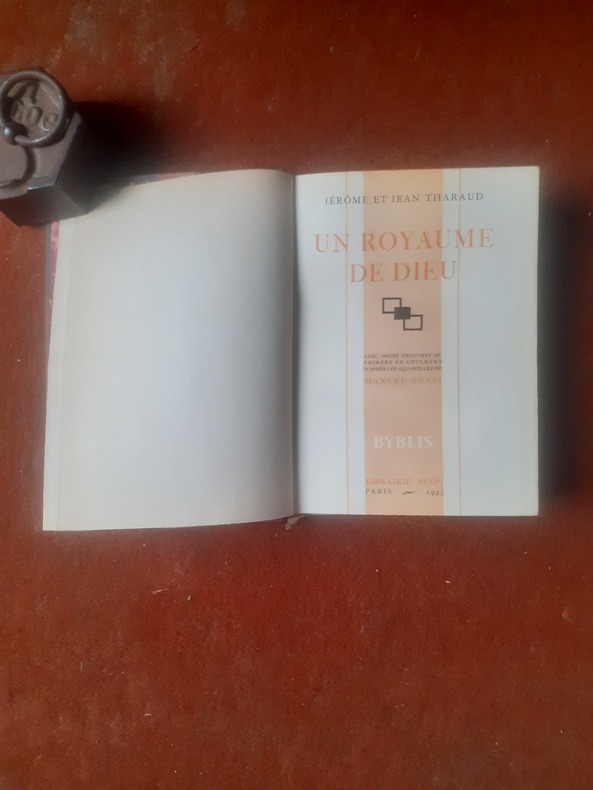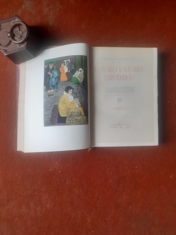 avec 12 gravures imprimées en couleurs d'après les aquarelles de Manuel Orazi, exemplaire sur velin, n°1991. Roman écrit par les frères Jérôme et Jean Tharaud, deux écrivains français du début du 20e siècle. Le livre a été publié en 1911 et est l'un de leurs ouvrages les plus célèbres. Le roman "Un royaume de Dieu" est une exploration de la vie monastique et religieuse dans un couvent français au début du 20e siècle. Il raconte l'histoire de la vie quotidienne des moines et des sœurs dans un monastère bénédictin, en mettant l'accent sur leur foi, leurs doutes, leurs sacrifices et leurs interactions au sein de la communauté religieuse. Le livre examine également les tensions entre la foi religieuse profonde et la modernité croissante qui sévissait à l'époque. Il offre un regard sur les luttes intérieures des personnages face aux questions de la foi, de la vocation et de la vie spirituelle. "Un royaume de Dieu" est souvent considéré comme une œuvre importante de la littérature religieuse et spirituelle française de son époque. Il est également salué pour sa représentation réaliste de la vie monastique et de la spiritualité, ainsi que pour sa réflexion sur les enjeux religieux et sociaux de l'époque. vol relié, demi cuir à coins, superbe reliure, tranche de tête dorée, couvertures d'origines conservées, 190x125, parfait état intérieur, 207pp Paris, Plon 1933