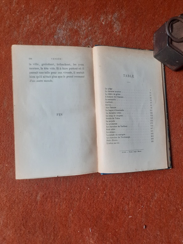 Table des Matières: Biographie de Henri de la Rochejaquelein: .......... Page(s) .......... 171, 193, 225 - Biographie de Charette: .......... Page(s) .......... 277, 301 - Bulletin Bibliographique. - L'Epopée Vendéenne, par M. Gustave Gautherot: .......... Page(s) .......... 317 - Dossiers des Vendéens prisonniers à Nantes pendant la Révolution: .......... Page(s) .......... 22, 46, 83, 147, 162, 244 - Echos-Ephémérides de la Vendée militaire (fin): - Etymologies Vendéennes. - Réorthe (La): - Etymologies Vendéennes. - Rocheservière: .......... Page(s) .......... 88 - Etymologies Vendéennes. - Roche-sur-Yon (La): .......... Page(s) .......... 121 - Etymologies Vendéennes. - Rochetrejoux: .......... Page(s) .......... 133 - Etymologies Vendéennes. - Rosnay: .......... Page(s) .......... 249 - Etymologies Vendéennes. - Saint-André-d'Ornay: .......... Page(s) .......... 275 - Etymologies Vendéennes. - Saint-André-Goule-d'Oie: .......... Page(s) .......... 309 - La Vendée... dans Plutarque (suite): Petit Musée traditionniste de la Vendée. - Confrérie de la "Marmite des Pauvres" à Fontenay-le-Comte: .......... Page(s) .......... 113 - Petit Musée traditionniste de la Vendée. - La confrérie du "Pot-à Bouillon" et les "Pères des Pauvres" à Noirmoutier: .......... Page(s) .......... 271 - Petit Musée traditionniste de la Vendée. - Les Fées dans la tradition vendéenne: .......... Page(s) .......... 298 - Petits Papiers de la Vendée militaire. - Un écho républicain des Colonnes infernales: .......... Page(s) .......... 153 - Petits Papiers de la Vendée militaire. - Une Vendéenne sauvée et épousée par un Bleu: .......... Page(s) .......... 314 - Petites chroniques vendéennes. - Bizarre avancement d'un instituteur-adjoint: Petites chroniques vendéennes. - A propos de palmes académiques: Petites chroniques vendéennes. - Une enquête sur les centenaires en Bas-Poitou: .......... Page(s) .......... 234 - Quelques mots sur la chouannerie: .......... Page(s) .......... 137 - Récits de la "Grand'Guerre". - "Histoire" d'une asse de crème et d'un "bon Bleu": .......... Page(s) .......... 289 - Statues et Statuettes de la Vendée militaire. - Le chevalier de Chantreau (suite et fin): .......... Page(s) .......... 76, 97, 129, 258 - Une infirmière de la Vendée militaire: Soeur Agnès (suite et fin): .......... Page(s) .......... 3, 33, 92, 116 ..... TRES RARE ...... en bon état (good condition). bon état