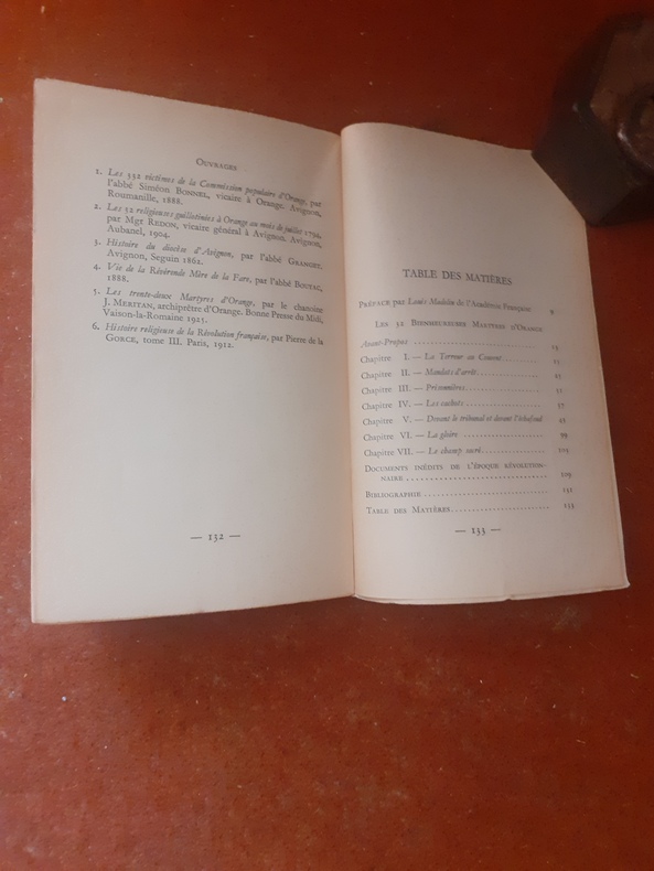 Dans l'horreur qu'inspire cette période sanglante de la Révolution française, la "Commission d’Orange" tient une place particulièrement affreuse. En effet, entre le 1er messidor et le 16 thermidor — soit 46 jours et 42 séances — les membres de cette Commission installée et surveillée par le conventionnel Maigret n’expédièrent pas moins de 332 “inculpés” à la guillotine. Parmi ces victimes de la folie meurtrière, trente-deux religieuses - bienheureuses martyres d'Orange béatifiées par Pie XI le 10 mai 1925 - guillotinées pour avoir seulement refusé ce qu'elles considéraient comme un acte d'apostasie et qui montèrent à l'échafaud en chantant le Magnificat... comprend pp. 108-129 : "Documents inédits de l'époque révolutionnaire. Un village sous la Terreur (Piolenc, village à 6 km au nord d'Orange). Voir le sommaire sur photos jointes.