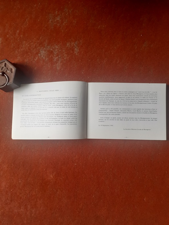 Société d'Histoire Locale de Montgeron, 1988, in-8 rel. oblong (21 x 15),141 p., reproduction de cartes postales anciennes, plan, couverture piquée, intérieur propre, bon état.