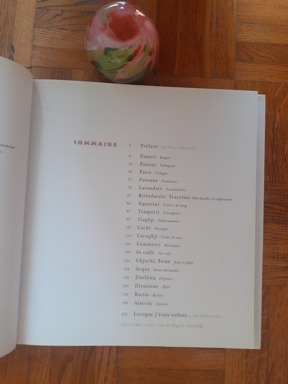 Les photographies et cartes postales anciennes et rares, recueillies ici, témoignent de la vie quotidienne en Corse à la fin du XIXe siècle et durant les premières décennies du XXe siècle. L'évolution de l'île depuis cette époque est telle, dans l'ordre économique et social, qu'on a peine aujourd'hui à imaginer quelle pouvait être autrefois la vie de ses villages. En contrepoint, les strophes corses de Rigolu Grimaldi évoquent ce passé avec poésie et nostalgie. Le récit, en français, de Rinatu Coti, par des portraits de personnages typiques et la description de curieuses situations, complète cet album du souvenir. Voir le sommaire sur photos jointes.