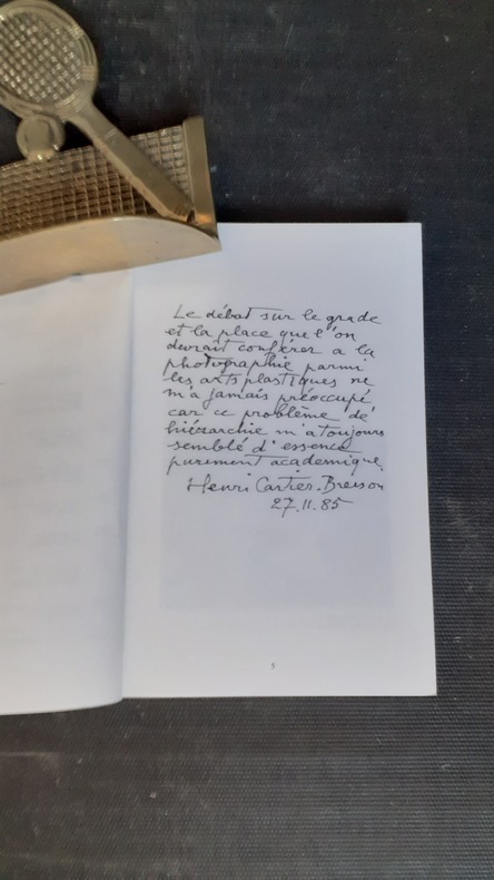 Editions Arthaud 1991. In-8 cartonnage éditeur à l'italienne de 151 pages au format 25 x 26,5 cm. Couvertures noires avec titre imprimé. Dos carré. Plats et intérieur assez frais malgré des renforcements, aux charnières intérieures, réalisés au papier adhésif blanc. Complet de la jaquette illustrée, avec infimes frottis aux coins. Traductions par Pierre Leyris, du catalogue de l'exposition présentée à New York, au Museum of Modern Art en 1987. Textes, liste des planches, table des photographies et bibliographie par Peter Galassi. Nombreuses illustrations et photographies par Henri Cartier-Bresson, in et hors texte. Tirage sur couché. Edition originale en bel état général. Precieux exemplaire avec dédicace non nominative de Henri Cartier-Bresson, signé de ses initiales.