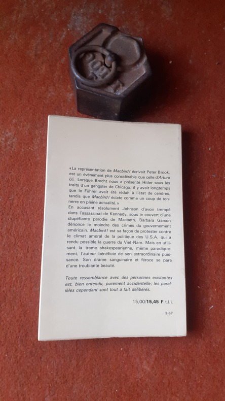 Denoël, 1967, in-12 br. (12 x 18,5),139 p., adaptation de Maurice Pons, couverture à rabats qui porte la mention : "La célèbre parodie de Macbeth. Du côté de Dallas", très bon état.