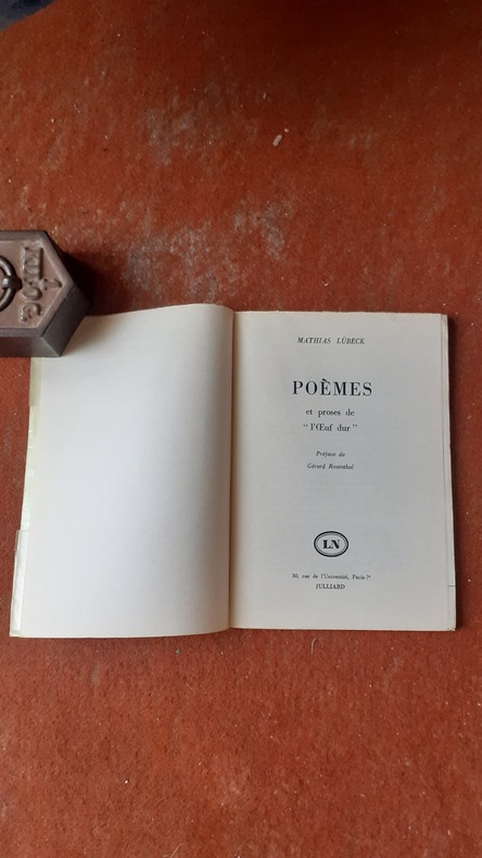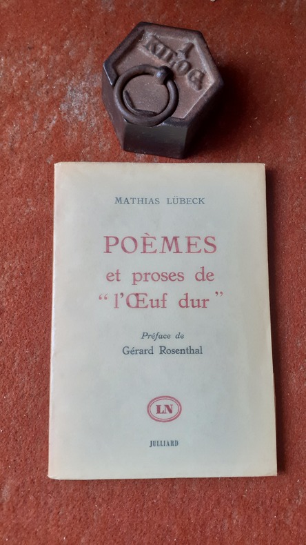 Poèmes et prose de Mathias Lübeck, parus dans la revue littéraire "L'Oeuf dur" qui a paru pendant plus de trois ans du printemps 1921 à l'été 1924, où l'on trouvait aussi les signatures de Max Jacob, André Salmon, Blaise Cendrars, Jean Cocteau, Pierre Mac Orlan, Francis Gérard (pseudo de Gérard Rosenthal), etc... Ce dernier évoque dans une émouvante préface la vie de son camarade de lycée et de revue fusillé par les Allemands le 8 juillet 1944 à Portes-lès-Valence. Voir sommaire sur photos jointes.