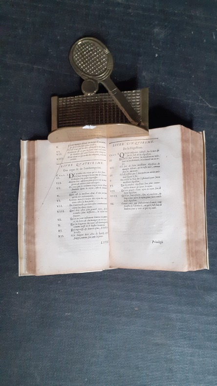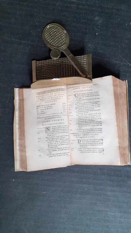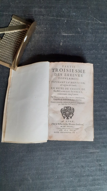 "Médecin et conseiller de Henri IV, Gaspard Bachot étudia la médecine à Paris et l’exerça pendant dix-sept ans à Thiers. L’ouvrage est le résultat de ses années d’expériences et s’inscrit en complément et en réfutation partielle des deux volumes publiés sous le même titre par le médecin dauphinois Laurent Joubert en 1578 et 1579. L’ouvrage renferme des allégations et conseils quelquefois surprenants : ""Les médecins tiennent qu’il n’y a point de si cruelle mort que celle qui arrive par la faim"" - ""Il ne faut ni lire, ni écrire, ni méditer après les repas"". Dans le cas d’un régime amaigrissant, l’auteur conseille ""Le vin sera blanc, verdelet, vieux et bu plutôt à la fin du repas que durant le manger ou à l’entrée"". Voir le sommaire sur photos jointes. "