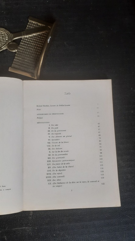 Texte établi par Michel Guibert à partir de la première édition (Paris, A. Sautelet) de 1826. Le plus célèbre traité de gastronomie français est en même temps un manuel de savoir-vivre et une description de la société riche et heureuse du temps de Louis-Philippe. Près de deux siècles après la mort de Brillat-Savarin, on reste confondu par la diversité des talents et des lumières de ce haut magistrat, aussi féru de belles-lettres que de bonne cuisine. Oeuvre de toute une vie, la Physiologie du goût, publiée en 1825, est une véritable somme de réflexions sur les sens en général, sur le goût en particulier. Brillat-Savarin a agrémenté le tout d'un bouquet d'anecdotes qui composent le plus savoureux des tableaux de moeurs. La longue introduction de Roland Barthes en révèle les aspects inconnus et dresse un tableau nouveau des désirs et des joies des sens. Le plaisir de manger exige, sinon la faim, au moins l'appétit. "Le plaisir de la table est le plus souvent indépendant de l'un et de l'autre. Celui qui reçoit ses amis et ne donne aucun soin personnel au repas qui leur est préparé n'est pas digne d'avoir des amis" (Brillat-Savarin). Voir le sommaire sur photos jointes.
