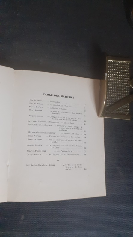 Chasser à la billebaude : mener une partie de chasse où l’on n’a point formé de cordon, ni distribué les places, et où chacun tire à sa fantaisie. Douze récits par le Duc de Brissac (La croisière de l'Achilleus ; De l'Empire Inca au Pérou moderne), le Baron de Janti (Débûchers d'Yveline ; Fastes impériaux et royaux de Rambouillet), Henri Lemoine (Un curé de Saint-Arnoult dans l'affaire Naundorf), Jacques Levron (La vie sociale à Rambouillet aux XVe et XVIe siècles ; Un voyageur au XVIIe siècle : François Le Gouz), Maud Sacquard de Belleroche (George Sand), Maurice-Pierre Boyé (Les Vaux-de-Cernay), Emile Auvray (Corbreuse au Moyen Age), Odette Boucher (une fresque à Houdan) et Andrée-Madeleine Duchet (Poètes de l'Yveline)