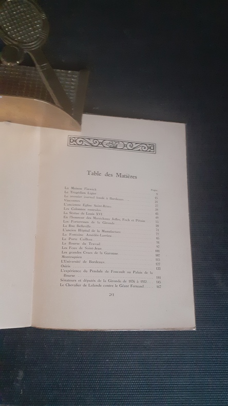 TABLE DES MATIERES : Préface de l’édition 1930 .La Fontaine de Sainte-Croix La Rue Garat.L’Impératrice Eugénie et le Prince ImpérialLa Ferronnerie d’art au xvm« siècle .Imprimeurs et LibrairesUne Statue de Messaline .La Tour Pey-Berland ..Les Rosières de Pessac et de La Brède ..La Rue de la Paix .Le Tragédien Lafon .La Maison Bonaffé .L’Amiral Villaret de Joyeuse Le Musée de Carreire Le Pavé-des-Chartrons .Les Cœurs loin du Corps .Le fameux démagogue Marat Le Cours Messidor .Mascarons et Coquilles ..Une Famille de bourreaux ..La Porte-Basse ..Le Peintre Bouguereau Le Marché Royal A la gloire d’Ausone .. La Fontaine de Pedouillet Louis XI .La Plantation d’un « mai » .La « Garonne » ..La Foire Saint-Fort .Les Bordelais à l’Académie française Le Marché des Grands-Hommes ..La Belle Allée et le Chemin du Rouquet Rues ou maisons natales de grands Musiciens bordelais.L’ancienne « Maison-Daurade » .Le sauvetage du « Colombus » Souvenirs bordelais sur Talma Les tremblements de terre dans le Sud-Ouest . Classification Dewey : 908.447-Régionalisme : Aquitaine
