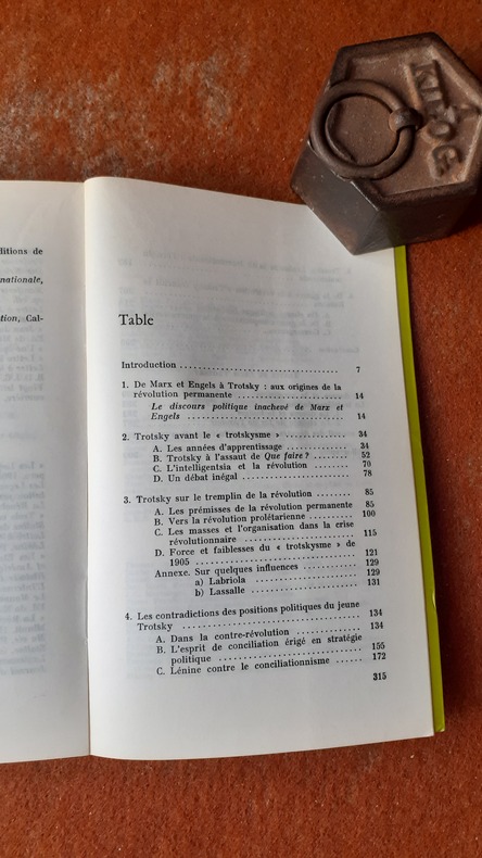 Ce livre n’est pas une biographie savante du jeune Trotsky mais l’évocation engagée d’un itinéraire politique, théorique et militant. Au fil de cet ouvrage, l’auteur s’efforce donc de suivre les sinuosités de cet itinéraire complexe, souvent contradictoire : de l’antimarxisme au marxisme "iskriste" du tout jeune Bronstein, de l’antibolchevisme virulent de 1904 au bolchevisme critique de 1917. Dans cette première phase de la vie politique de Trotsky, le "trotskisme" marche d’un bas boiteux : c’est l’époque du premier déploiement de la théorie de la révolution permanente, appuyée sur l’intuition géniale du profil de la révolution russe ; c’est aussi celle de la politique "malheureuse" de Trotsky, embourbé dans les marais du conciliationnisme et de l’équilibrisme, entre les deux fractions de la social-démocratie russe. L’ouvrage s’achève sur une évocation de 1917. La révolution d’Octobre ne signifie pas simplement l’ascension de Trotsky à la dimension historique. Au plan théorique, c’est, pour Trotsky, la seconde mutation fondamentale, celle qui l’amène à fondre la théorie de la révolution permanente dans le creuset politique et organisationnel du bolchevisme. Voir le sommaire sur photos jointes.