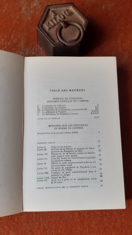 Éd. orig. peu courante de cet essai historique majeur sur les Cent-Jours, la 1re partie parut d’abord par extraits dans le périodique libéral "La Minerve française" de septembre 1819 à mars 1820. "(...)Il faut voir naturellement dans ces mémoires présentés sous forme de lettres une justification de l'attitude de Benjamin Constant en 1815, justification au demeurant prudente en raison de la réaction qui suivit l'assassinat du duc de Berry." (Tulard, 350 ; Clouzot, 71).