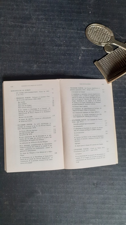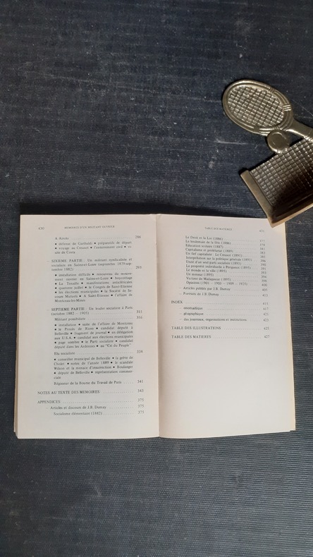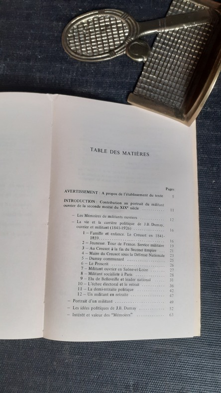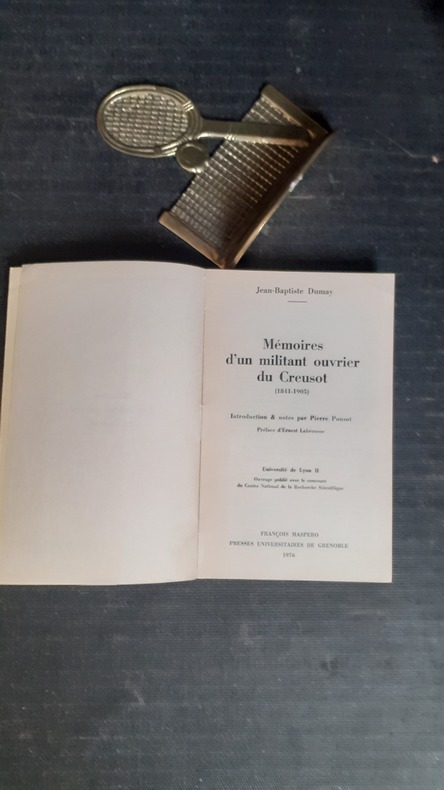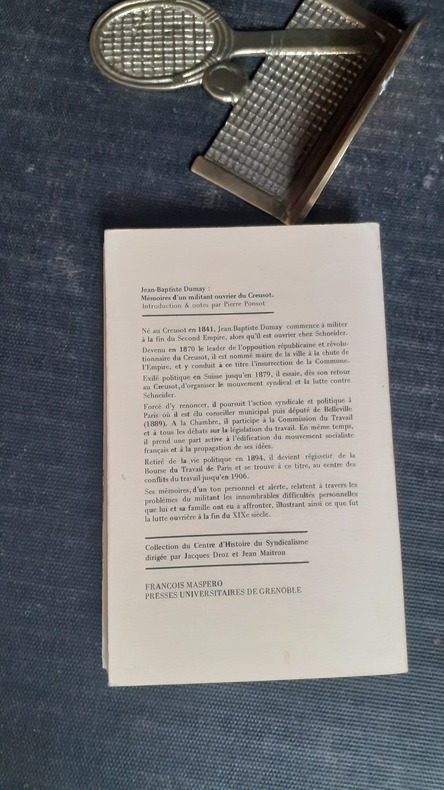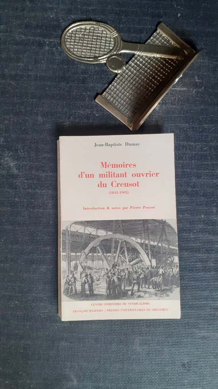 "Un livre qui fera date puisqu'il s'agit d'une des seules autobiographies d'un militant ouvrier de la seconde moitié du XIXe siècle et d'un ouvrier dont le témoignage est d'autant plus précieux qu'il travaillait au Creusot, symbole s'il en fut de la première révolution industrielle. Ces mémoires, consciencieusement introduites et annotées par P. Ponsot, nous décrivent donc la vie mouvementée de Dumay, depuis sa naissance de fils posthume au Creusot, jusqu'à son élection au siège de député de Belleville, puis à la régie de la Bourse du travail de Paris qui clôt sa carrière politique. C'est d'abord le témoignage exceptionnel d'un ouvrier, politiquement conscient, sur les événements de son époque, avec les traits d'un caractère farouche, tenace et non dépourvu d'orgueil comme le prouvent ses démêlés avec son camarade Alphonse Assi en 1870. Ensuite, avec le dense et indéfinissable vécu que cela sous-tend, c'est un exemple vivant d'attitude politique sur l'écheveau tout aussi embrouillé que de nos jours, des idéaux révolutionnaires : Dumay est à la fois et tour à tour réformiste, révolutionnaire et nationaliste comme bien des militants ouvriers de son époque sur lesquels le sens de l'histoire marxiste exerce encore peu d'influence. Enfin, l'historien des mentalités populaires du XIXe siècle découvrira un trésor dans la lecture du récit du "Tour de France" et du service militaire du jeune creusotin." (J.-R. Trochet, Ethnologie française, 1977). Voir le sommaire sur photos jointes.
