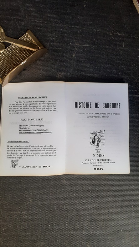 "Ce livre est pour moi l'offrande de ma piété filiale à la cité de ma jeunesse. Il voudrait donner aussi à tous les fils de Carbonne des raisons d'accroître en eux l'amour de la petite patrie. Il a été écrit avec ferveur, après des décades d'années de recherches scrupuleuses et impartiales qui, me semble-t-il, ont abouti à des résultats à peu près définitifs. Impartiales, mais non indifférentes. Les catastrophes, les malheurs et parfois les joies, dont est tissée l'histoire de Carbonne, ce sont nos douleurs et nos joies. J'ai tâché de les faire revivre comme nos aïeux les vécurent. A l'historien, cette évocation du passé a révélé des sources d'information insoupçonnées et d'une très grande richesse. J'ai pu reconstituer de très nombreux documents perdus d'une importance capitale, grâce à certains textes jusqu'ici ignorés ou méconnus. Exemple dont pourront profiter d'autres monographies semblables. L'intérêt de celle-ci dépasserait alors les limites de l'histoire locale, pour rejoindre la grande histoire de la formation politique et sociale de la France à travers les siècles". Voir le sommaire sur photos jointes.