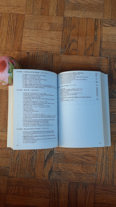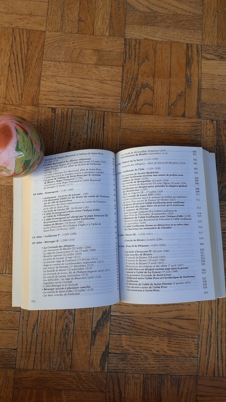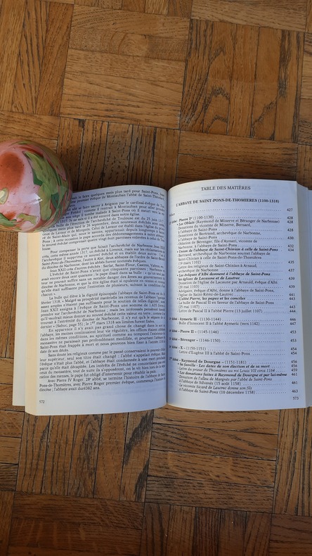 L'abbaye de Saint-Pons-de-Thomières fut fondée en 936 par le comte de Toulouse, Raymond Pons. L'auteur étudie le moment, le but et les circonstances de cette fondation. Le Xe siècle voit en effet l'affaiblissement de l'Etat (luttes dynastiques), la crise morale et matérielle que traverse l'Eglise. Cet ouvrage n'est pas à proprement parler l'histoire de l'Abbaye de Saint-Pons-de-Thomières, mais plutôt le recueil des documents intéressant ce monastère. Suivi pp. 579-761 d'une étude sur la Bibliothèque de l'Abbaye au 18ème siècle (pp. 579-632) et du catalogue de la bibliothèque l'an 1276