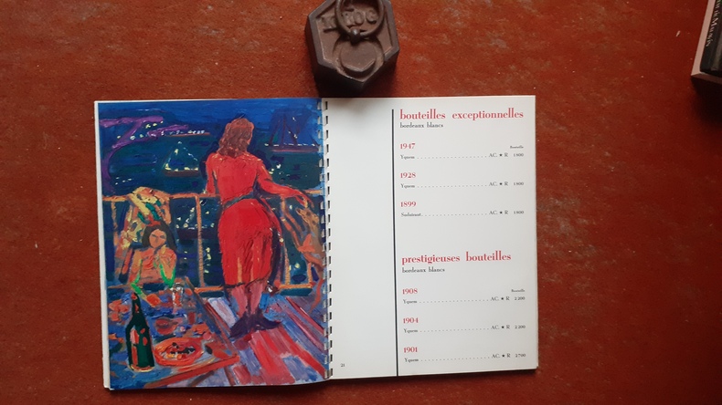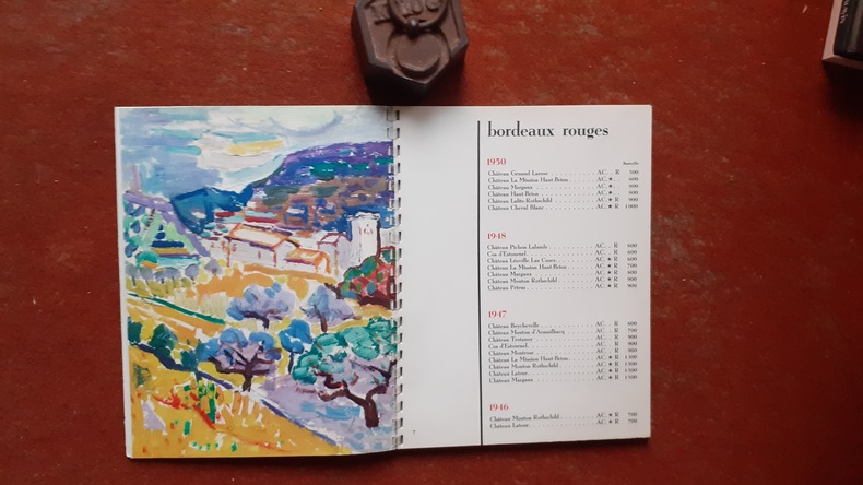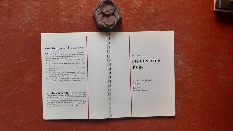 Nicolas, Charenton-Le-Pont [Montrouge, Draeger], 1958, in-8, 32 pp, Broché, dos à spirales, couverture rempliée illustrée en couleurs, Liste des grands vins fins éditée par la maison Nicolas pour l'année 1958. Couverture illustrée en couleurs et 18 peintures de Limouse (1894-1989) reproduites en couleurs. JOINT : La lettre imprimée à en tête de la Direction de Nicolas, à Charenton, envoyée aux souscripteurs des plaquettes-tarifs Nicolas. Oberlé, Fritsch n° 597/24. Couverture rigide