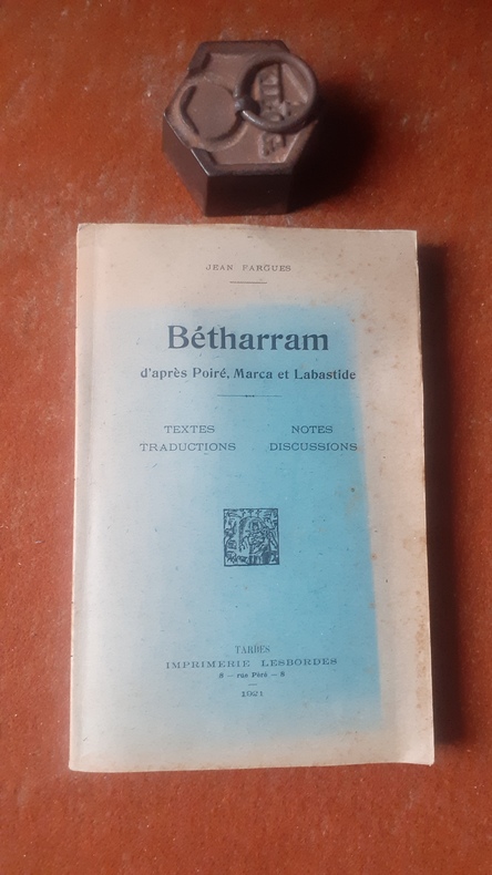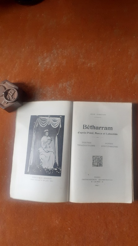 Tarbes, Imprimerie Lesbordes, 1921, gr. in-8 br. (16,5 x 25), 522 p., E.O., 36 gravures (dont une grande planche dépliante in-fine "Portrait de la Montagne de Bétharram"), partition (musique et paroles) d'un vieux chant des pèlerins de Betharram, couverture décolorée en bordure, intérieur frais, exemplaire en partie non-coupé, bon état.