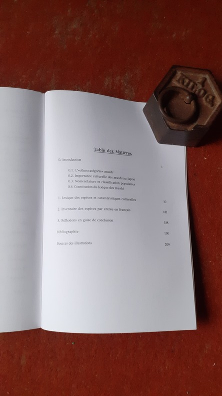 L'ouvrage se présente comme un lexique fournissant pour chaque taxon envisagé, outre ses noms vernaculaires japonais et son statut nomenclatural, les appellations communes et scientifiques en français. Il s'agit donc d'un outil essentiel pour les traducteurs et les chercheurs issus de diverses disciplines, ayant comme centre d'intérêt le Japon, qui cherchent des correspondances précises pour un mushi donné ou qui veulent en connaître davantage sur sa place dans la culture. Plus encore, par la richesse des informations ethnographiques, historiques et biologiques qu'il recèle, par la pertinence iconographique des nombreuses illustrations, par la présence de haiku ancien et modernes, "culturellement significatifs", que l'auteur a traduits, cet ouvrage se lit au fil des pages comme une monographie de grand intérêt ethnologique. Voir le sommaire sur photos jointes.