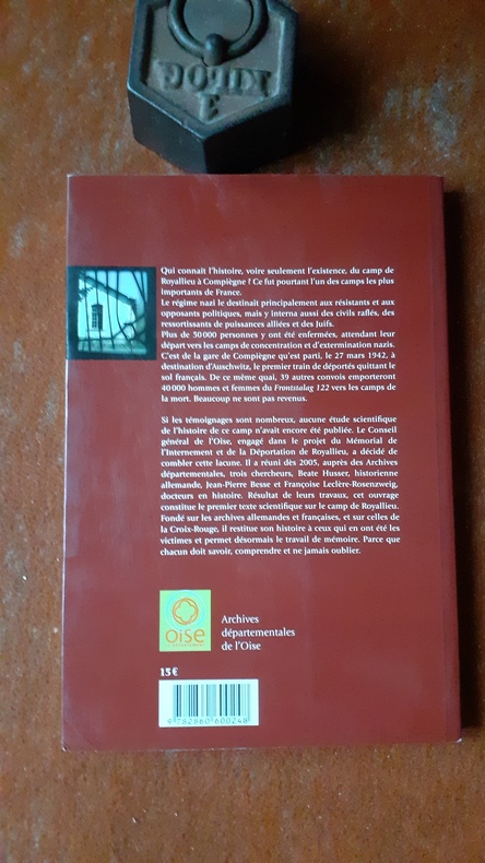 Le camp de Royallieu à Compiègne fut l’un des camps d'internement les plus importants de France. Si les témoignages sont nombreux, aucune étude scientifique de l’histoire de ce camp n’avait encore été publiée. Le Conseil général de l’Oise, engagé dans le projet du Mémorial de l’Internement et de la Déportation de Royallieu, a décidé de combler cette lacune. Il a réuni dès 2005, auprès des Archives départementales, trois chercheurs, Beate Husser, historienne allemande, Jean-Pierre Besse et Françoise Leclère-Rosenzweig, docteurs en histoire. Résultat de leurs travaux, cet ouvrage constitue le premier texte scientifique sur le camp de Royallieu. Fondé sur les archives allemandes et françaises, et sur celles de la Croix-Rouge, il restitue son histoire à ceux qui en ont été les victimes et permet désormais le travail de mémoire. Voir le sommaire sur photos jointes.