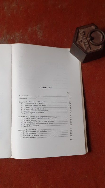 Algérienne d'origine européenne, enseignante à Alger, Claudine Chaulet publie cette thèse de doctorat de 3ème cycle de sociologie, qui eu le professeur Jacques Berque comme rapporteur. Etude de l’autogestion algérienne réalisée dans l’optique de la sociologie rurale. Des enquêtes ont été menées, six ou sept ans après l’indépendance, dans treize domaines agricoles situés dans la plaine de la Mitidja. Leur conclusion pourrait sembler négative tant apparaissent grandes les difficultés de tous ordres pour faire vivre au quotidien une autogestion véritable. Mais si l’on se reporte à la situation de l’été 1962, force est de constater que l’énergie et la compétence de nombre de travailleurs ont permis le maintien d’une production suffisante pour que l’économie du pays ne s’effondre pas. Voir le sommaire sur photos jointes
