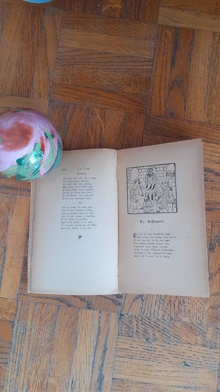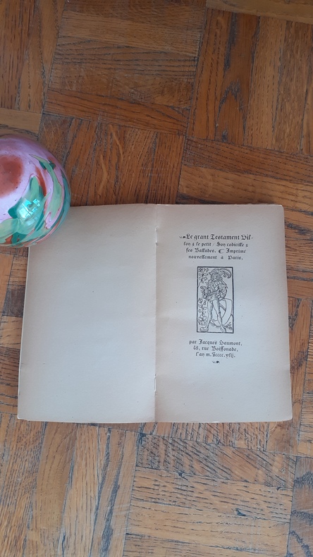 Le grand testament Villon et le petit son Codicille et ses ballades, en feuilles sous double emboitage crème, frontispice + 13 ht + 30bandeaux et culs-de-lampes coloriés à la main par M.Beaufumé, enlumineur d"art, un des 1650 exemplaires d"un tirage total de 1777:1495, très bon état
