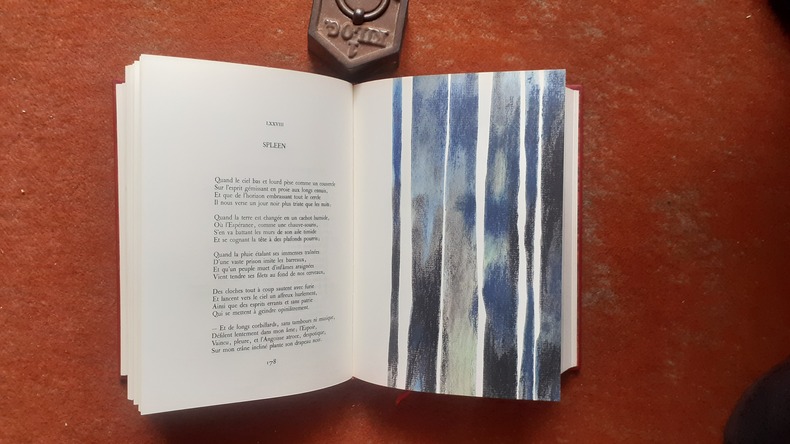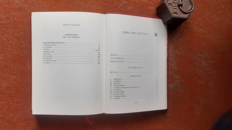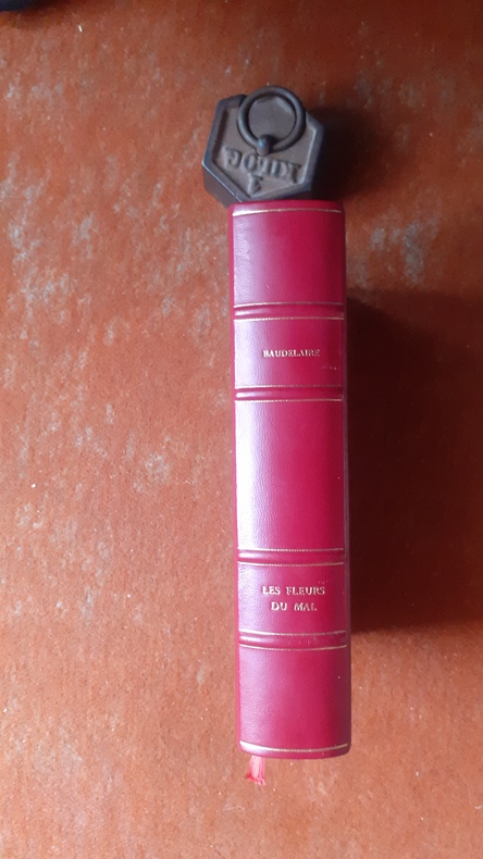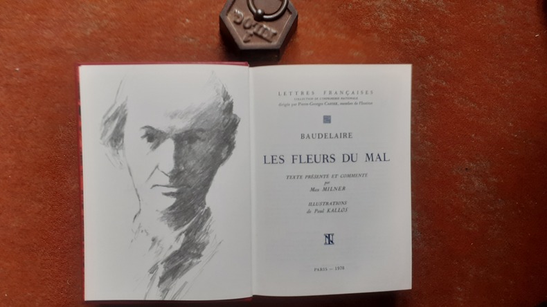 Imprimerie Nationale, 1978, in-8 rel. pleine peau rouge (16 x 23), 435 p., coll. "Lettres françaises", N° 3304/5000 sur Rives 25% chiffon, texte présenté et commenté par Max Milner, 10 compositions de Paul Kallos, 20 illustrations d'inspiration baudelairienne, dos à 4 faux-nerfs, titrage doré, monogramme IN estampillé à froid sur le plat sup., tranche supérieure dorée, bon état.