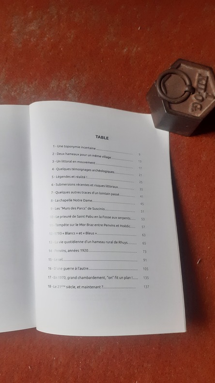 L'auteur, enfant du pays, raconte l’histoire du bourg de Penvins, à l’est du canton de Sarzeau, du néolithique à nos jours. Certains chapitres sont éloquents, comme celui sur l’industrie du sel, bien avant la période romaine, ou un autre sur l’histoire passionnante de la chapelle Notre-Dame, installée sur la pointe. Il y a aussi ces guerres qui ont laissé des cicatrices, avec cette carte des blockhaus, de Penvins et Landrezac. L'auteur relate aussi la lutte de la population locale contre un projet de la Satmor (Société d’aménagement touristique du Morbihan). Voir le sommaire sur photos jointes.