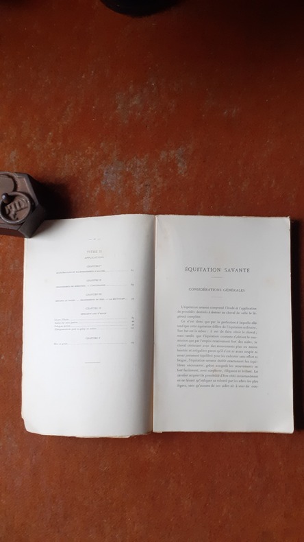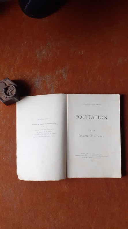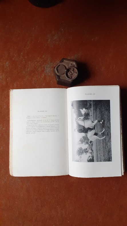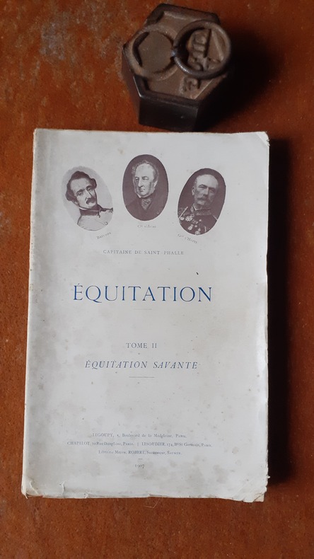 Legoupy et alii 1907, grand in-8 broché, couverture illustrée, 115 p. (deux petits manques sans gravité au quatrième de couverture, sinon bon exemplaire partiellement non coupé) Avec 17 planches HT. Rare édition originale de cette deuxième partie de l'enseignement du grand écuyer de Saumur (1867-1908), qui se voulait dans la continuité de Baucher, de d'Aure et de L'Hotte.