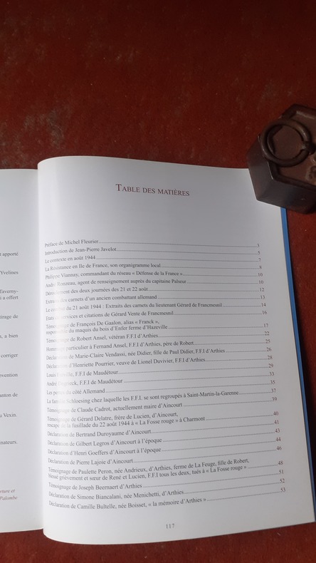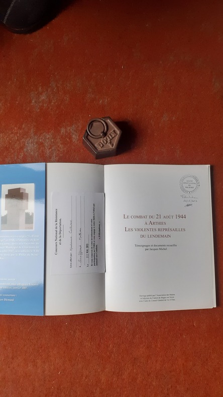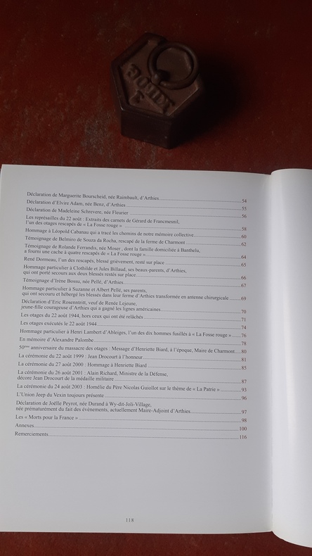 "Le 21 août 1944, sans tirer un coup de feu, les FFi capturent un groupe de huit cyclistes allemands montant la côte à la sortie d’Arthies avant le carrefour d’Enfer. Ils neutralisent ensuite une traction-avant dans un virage après le domaine de la Feuge. Un FFI est blessé grièvement et parvient à gagner les lignes américaines avec l’un de ses camarades. Les autres FFI regroupés dans l’enceinte du château d’Arthies attaquent des véhicules faisant mouvement vers Mantes : deux Allemands sont tués. Un FFI est mortellement blessé (Louis Fréville, FFI de Maudétour). Un élément blindé américain vient chercher les prisonniers allemands. Les Allemands incendient plusieurs hangars à Arthies et opèrent de nuit un bombardement aérien sans causer de grands dommages car les aviateurs s’étaient repérés sur les hangars en feu hors du village. Le 22 août, les Allemands raflent des otages à Arthies et Aincourt, abattent deux hommes dans ce village, en blessent un troisième et en emmènent vingt-cing à « La Fosse Rouge », sur le territoire de Charmont. Ils font descendre les otages des camions en prétextant vouloir leur rendre la liberté et ouvrent le feu. Dix hommes meurent immédiatement, sept sont blessés dont deux grièvement. Parmi les huit qui en réchappent indemnes, quatre trouvent refuge à Banthelu" (Maiton patrimionial). Voir le sommaire sur photos jointes.