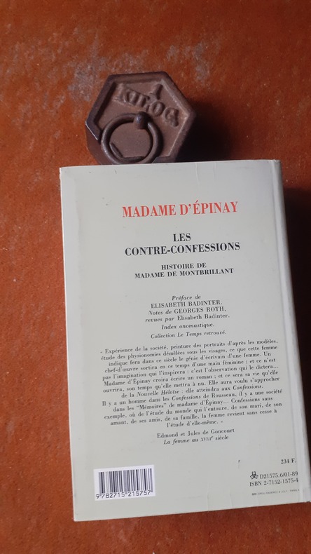 Mercure de France "Le Temps retrouvé n°55" 1989, fort in-8 couverture souple illustrée, XXXII-1656 p. (haut du dos heurté, sinon très bon état) Notes et index. Fort important pour l'histoire du XVIII°, Madame d'Epinay, en voulant écrire un roman à l'instar de Rousseau, ayant mis sa vie et ses relations en scène ; "confessions sans exemple", dirent les frères Goncourt.