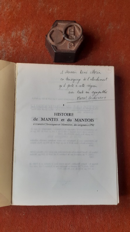 Meulan, chez l'auteur, 1971, gr. in-8 br. (18,5 x 25),506 p., 1ère édition, collection de "Travaux et de Documents pour servir à l'histoire du Mantois et du Vexin", 24 planches h.-t., bel envoi de l'auteur, couverture plastifiée de protection, très bon état.