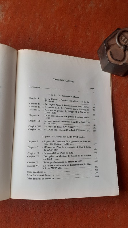 Ce livre de référence traite dans sa première partie des Chroniques de Mantes qui constituent une véritable histoire de Mantes sous l'Ancien Régime et dépassent largement le cadre de cette ville. La seconde partie est la publication de Mémoires décrivant le Mantois aux XVIIe-XVIIIe siècles. Vingt quatre reproductions de cartes du Mantois et de Mantes à cette époque. Voir le sommaire sur photos jointes.