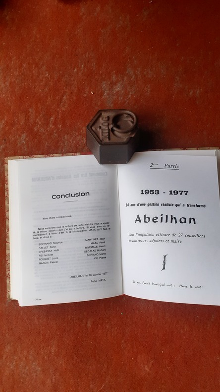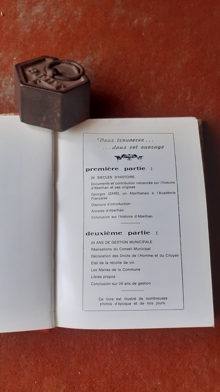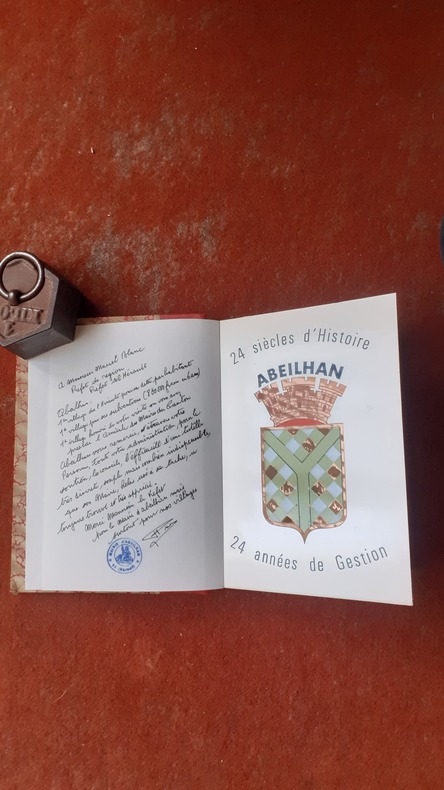 Livre du maire d'Abeilhan, composé de deux parties. Une première partie historique, une seconde consacrée à 24 ans d'administration municipale. La page de couverture porte le titre : "Abeilhan : 24 siècles d'histoire, 24 années d'une gestion réaliste"