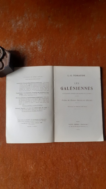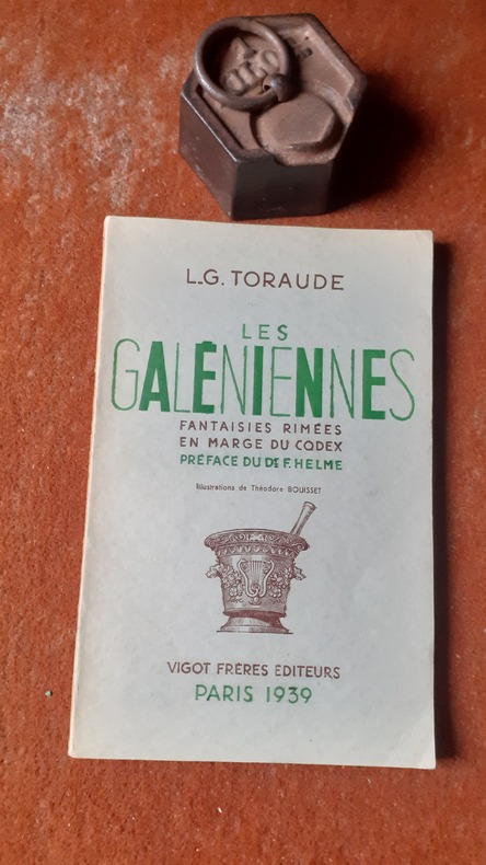 Toraude, pharmacien de son état, est considéré dans la préface, par son ami François Helme, comme historien, philosophe, poète.. Il célèbre, tout en délicatesse et avec humour, la pharmacie, en vers, l'art des potions, les fleurs, les eaux, les suppositoires, Naissance de la muse de Montmartre ... Ouvrage abondamment illustré par Léon Lébègue, Hérouard, Bonamy, Grimbert ... Infimes usures à la chemise et à l'étui. Tirage limité à 1.250 exemplaires sur papier de Luxe. Envoi daté et signé de l'auteur.