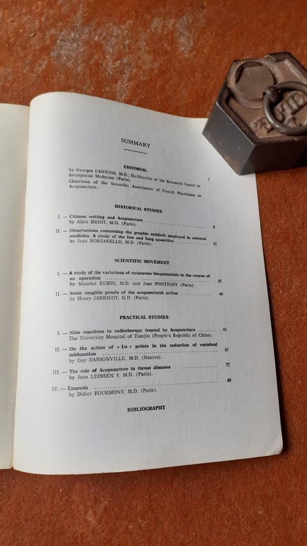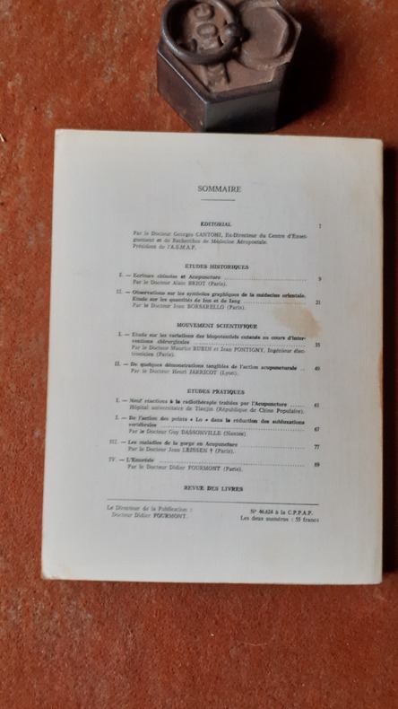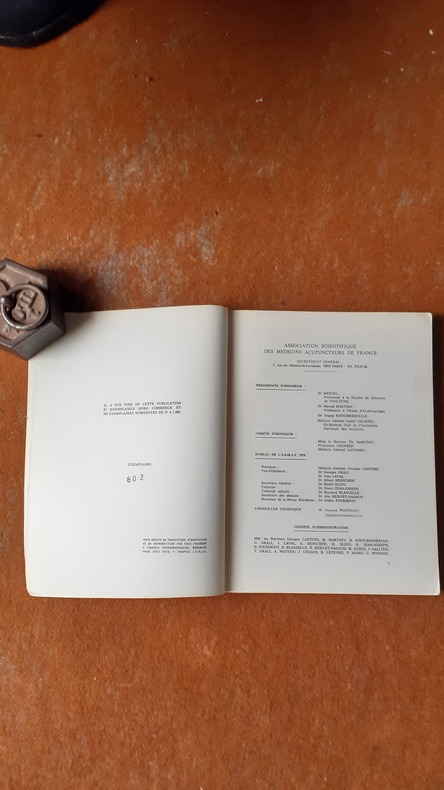 Association Scientifique des Médecins Acupuncteurs de France, 1974, in-8 br. (18 x 24), 125 p.,tirage à 1000 exemplaires numérotés, éditorial du Dr Georges Cantoni, 7 figures, 2 planches, bon état.