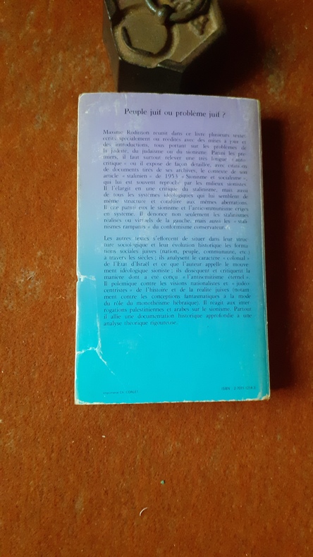"Après avoir retracé sans complaisance son parcours d'intellectuel juif anticolonialiste, Maxime Rodinson éclaire la trajectoire du peuple juif à travers les siècles, en l'inscrivant dans son contexte social et historique. Réunion de plusieurs textes écrits spécialement ou réédités avec des mises à jour et des introductions, tous portant sur les problèmes de la judéité, du judaïsme ou du sionisme. Ce recueil d'articles n'a rien perdu de son actualité, tant la question juive et l'État d'Israël restent l'objet de tous les délires et de tous les mythes : délire meurtrier ou négateur des antisémites, raccourcis manipulateurs de l'apologétique sioniste et judéocentriste, élucubrations simplistes d'une certaine propagande antisioniste. C'est la formation et la persistance de ces mythes que décrit cet ouvrage. Voir le sommaire sur photos jointes".